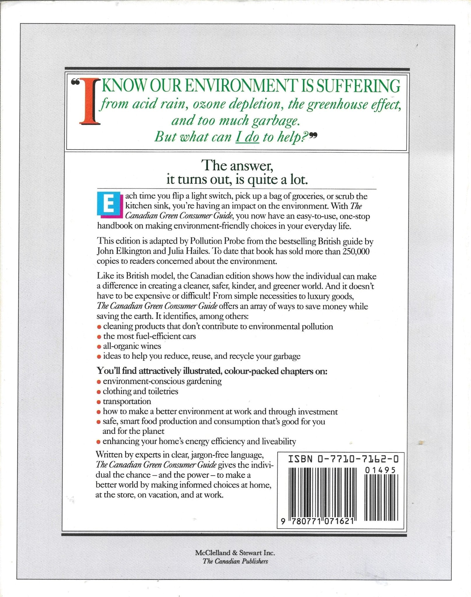 This exceptional resource book, still relevant, The Canadian Green Consumer Guide, is designed to educate readers of all ages, occupations, and lifestyles about how they can contribute to making the world a safer, healthier, and more environmentally friendly place. The guide empowers readers with the knowledge needed to initiate positive changes for a better planet.